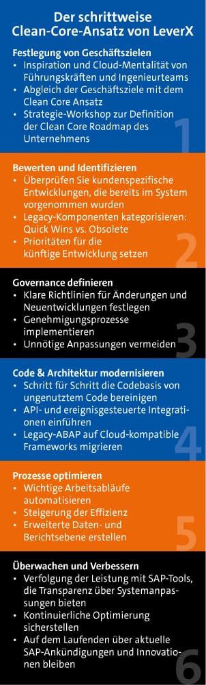 Zudem stellt Clean Core nicht nur eine technologische, sondern auch eine finanzielle Entscheidung dar: Geringere Gesamtbetriebskosten, höhere Skalierbarkeit und eine verbesserte Compliance tragen zu einer langfristigen Kapitalrendite (ROI) bei. Unternehmen, die auf diesen Ansatz setzen, profitieren von einer agileren Geschäftsstrategie und sichern sich einen Wettbewerbsvorteil durch kontinuierliche Innovation und eine optimierte Systemstabilität. So gelingt der Übergang zu einer modernen, modularen SAP-Landschaft, die nicht nur heutige Geschäftsanforderungen erfüllt, sondern auch die Grundlage für zukünftiges Wachstum und Profitabilität schafft.