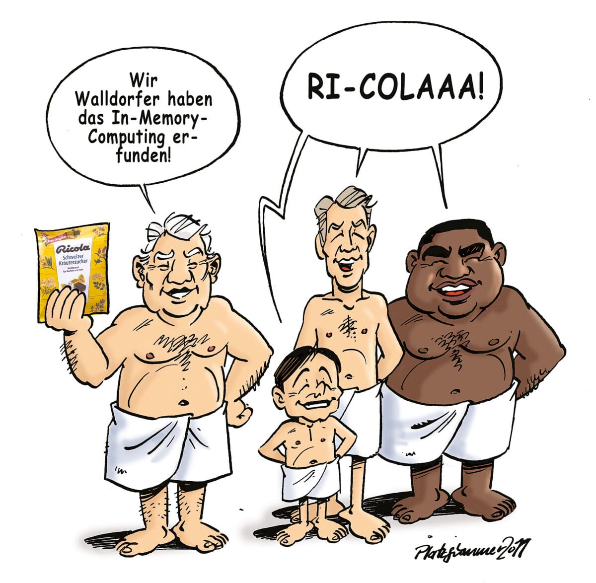 Wie SAP in Zukunft dem Innovationsverlust im Bereich KI begegnen will, das ist auch für Insider der SAP-Community vollkommen unklar. Die Datenbank Hana war die letzte eigenständige SAP-Erfindung unter Führung von Professor Hasso Plattner und seinem damaligen SAP-Technikvorstand Vishal Sikka, siehe Karikatur. In Anlehnung an einen bekannten Werbeslogan aus der Schweiz reklamierte SAP die Erfindung der In-memory-Computing-Datenbanken zur Gänze für sich. (pmf)
