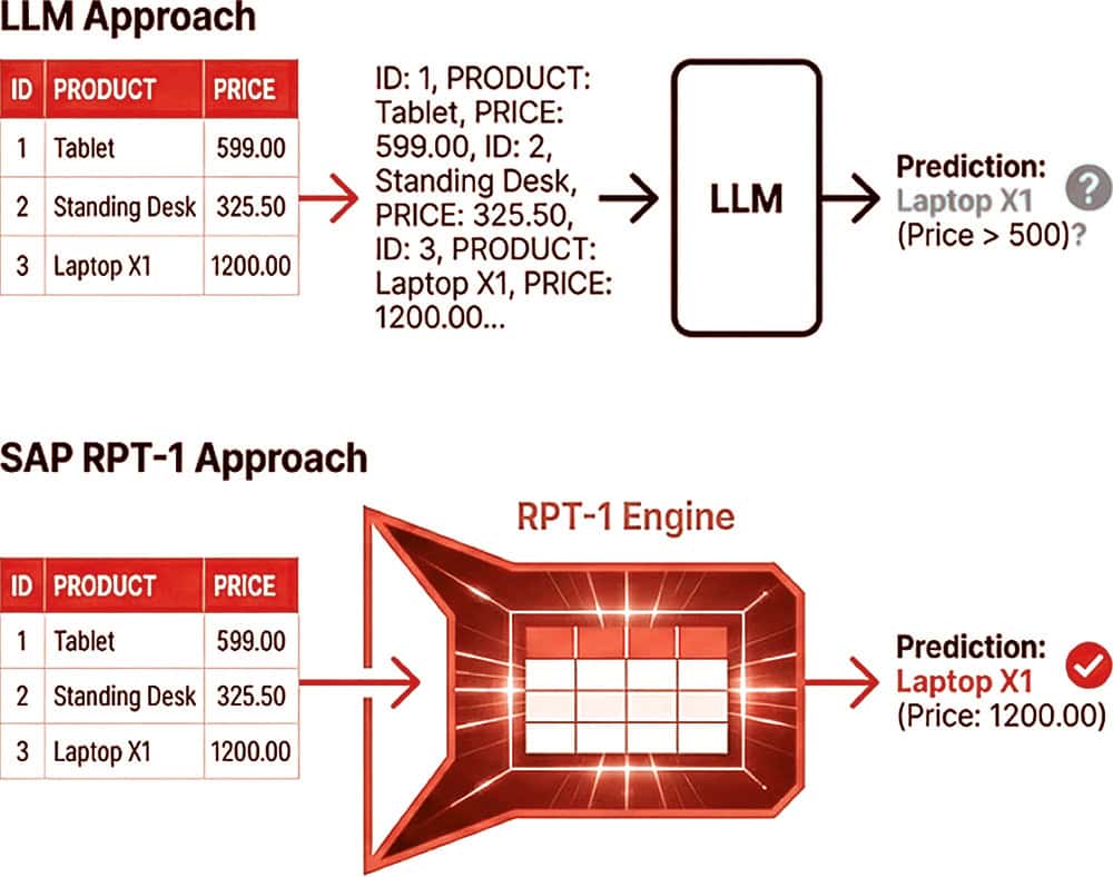 Der entscheidende Vorteil von SAP RPT-1 gegenüber den populären LLMs von OpenAI oder Anthropic liegt in der fundamentalen Art und Weise, wie Daten verarbeitet werden. Herkömmliche Sprachmodelle sind brillante Rhetoriker, scheitern aber oft kläglich an der simplen Arithmetik oder der präzisen Interpretation von Zahlenreihen. Wenn ein LLM die Zahl „1000“ sieht, wird diese oft in einzelne Token zerlegt, etwa in „1“, „0“, „0“ und „0“, und als Folge von Zeichen statt als mathematischer Wert behandelt, was bei Berechnungen zu den berüchtigten Halluzinationen führen kann.