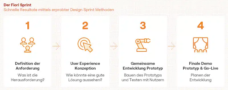 Ein solcher Fiori-Sprint setzt sich aus vier unterschiedlichen, im Idealfall einen Tag beanspruchenden Episoden zusammen. Zu Beginn gilt es, die Anforderungen zu identifizieren, beispielsweise nach dem im vorausgegangenen Absatz beschriebenen Ansatz. Im zweiten Schritt werden gemeinsam Details für die User Experience einer App erarbeitet. Der im Anschluss erstellte Prototyp vermittelt Nutzern erste Erfahrungen mit der Umsetzung der Funktion als App auf einem Smartphone, Tablet oder PC. Die Verantwortlichen erhalten nach dem erfolgreichen Test von den unterstützenden Beratern eine belastbare Kalkulationsgrundlage für die Entwicklung der funktionstüchtigen App und können deren Realisierung im Rahmen der S/4-Einführung passend priorisieren.
