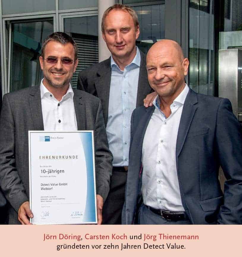 Das war für die Gründer Jörn Döring, Carsten Koch und Jörg Thienemann vor zehn Jahren noch eine weit entfernte Zukunftsvision, aber eine vielversprechende Grundlage für die Firmengründung der Detect Value GmbH in Walldorf und deren Motto: Detect Value in your Business Data!
