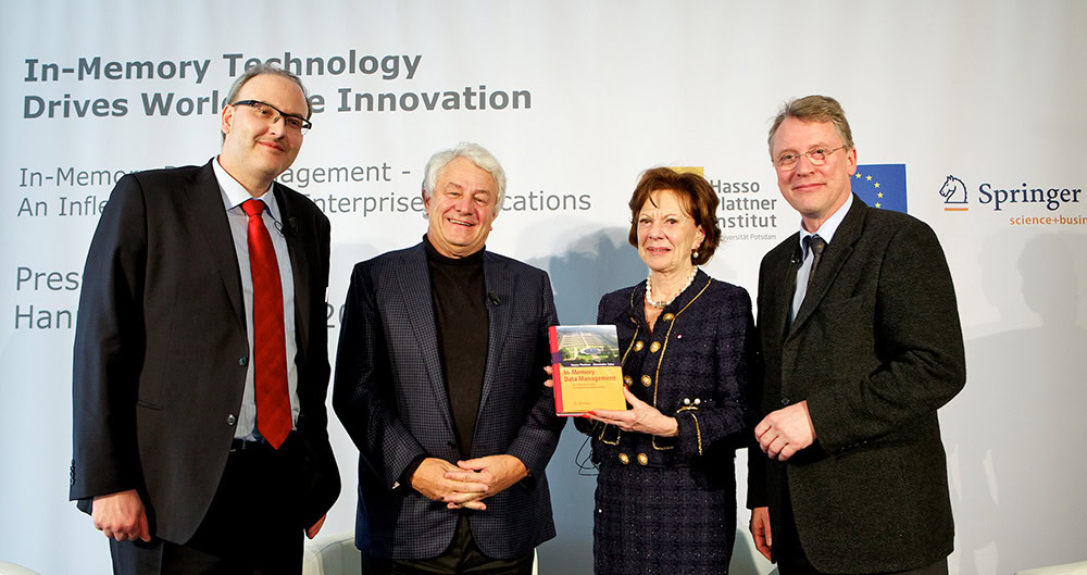 (from left to right) Book authors Prof. Alexander Zeier and Prof. Hasso Plattner as well as Neelie Kroes (EU Commissioner for the Digital Agenda) and Prof. Christoph Meinel (President of HPI) at CeBIT in Hanover on March 1, 2011.