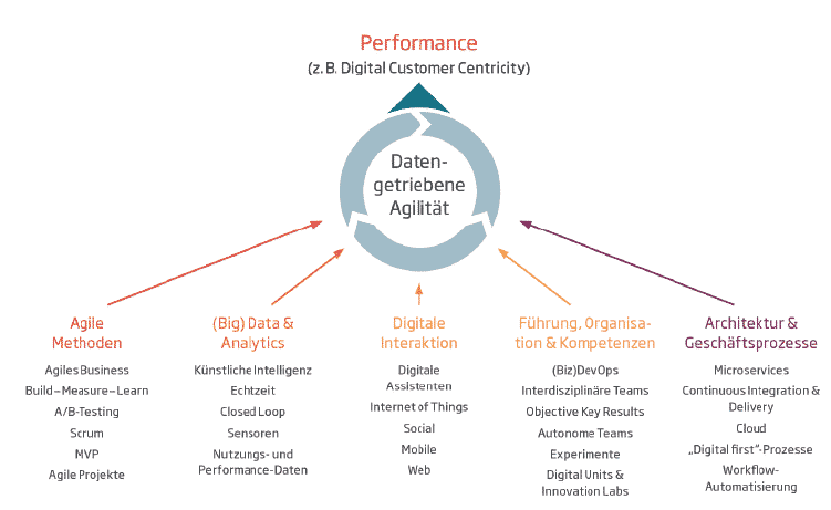 The market success of these digital giants, like that of many smaller startups, correlates with new ways of working that are fundamentally different from those of traditional companies and, taken together, constitute the excellence characteristic of data-driven agility. According to the study conducted by the consultancy in cooperation with researchers from the University of Hamburg and Leuphana University, the thrust of these novel ways of working is essentially fed by five sources: agile product and service development, extensive use of Big Data analytics, predominantly digital interaction both within the workforce and with customers, an innovation-friendly organizational and leadership model, and a largely automated architecture and process landscape.