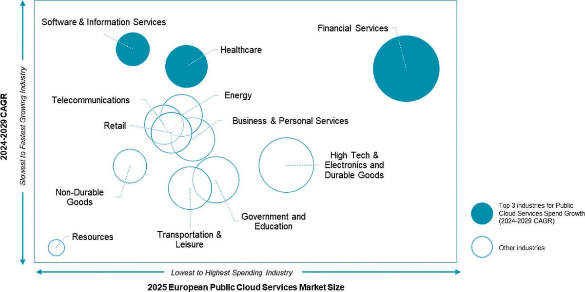 Market size and forecast for spending on European public cloud services by key IDC industries, 2024 to 2029.