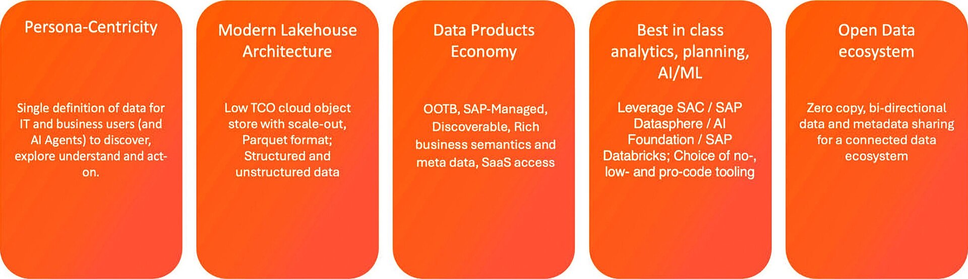 - Harmonization of all SAP and third-party data with fully managed functions for a business data fabric architecture, modernization of SAP Business Warehouse, planning, data engineering and AI/ML.