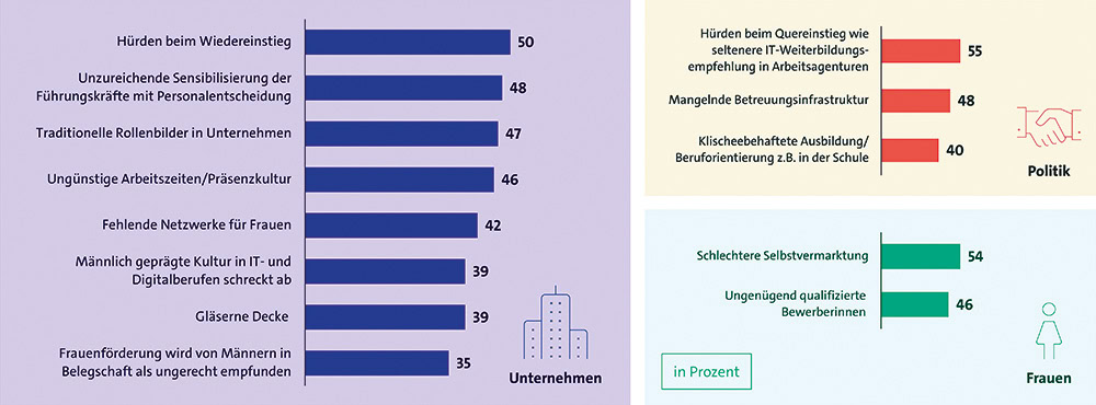 In the IT and digital sector as a whole, 89% estimate that significantly fewer women than men are employed. However, women remain underrepresented in professional practice. In 58% of German companies, less than half of employees are female - in 2025, the figure was 64%.