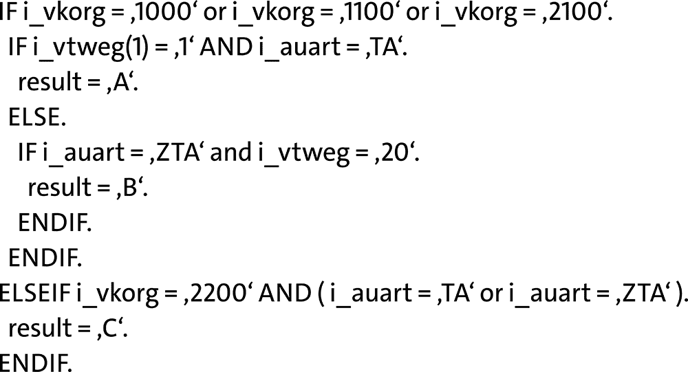 The good thing about unit tests is that they can be defined retrospectively for a class without affecting the logic of the class itself. For example, I can create a unit test for the following constellation: Ensure that the assertion i_vkorg = ‚1000‘, i_vtweg = ’10‘, and i_auart = ‚TA‘ returns the value „A.“ I can verify the result of this assertion with the press of a button.