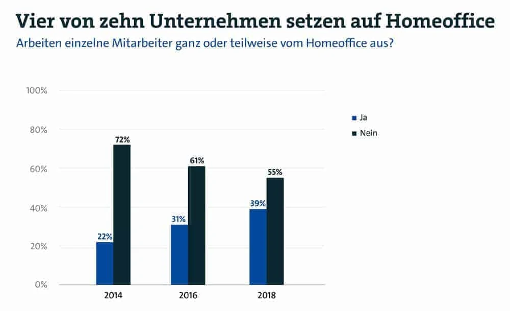 En 2016, casi una de cada tres empresas (30%) permitió a sus empleados trabajar desde casa, frente a solo una de cada cinco (20%) en 2014. Se espera que esta tendencia continúe. El 46% de las empresas asume que la proporción de sus empleados que trabajan desde casa aumentará en los próximos cinco años. El 50% espera que la proporción se mantenga constante.