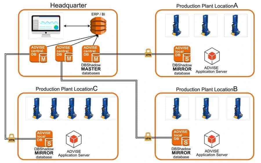 Sin embargo, el almacenamiento local de datos en cada máquina individual sería antieconómico, por lo que los servidores de bases de datos utilizados representan una instancia de base de datos central para cada ubicación.
