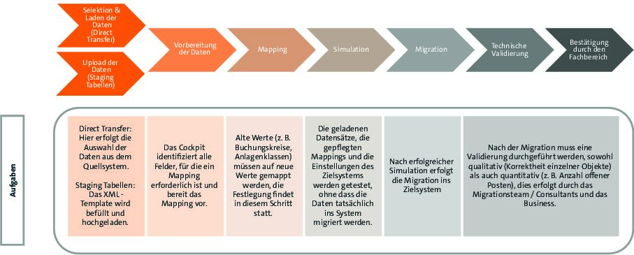 De este modo, en la primera iteración de la simulación pueden detectarse errores típicos, como períodos de migración no abiertos, contracuentas bloqueadas o códigos fiscales que faltan. Tras una simulación sin errores, tiene lugar la migración productiva de todo el volumen, por lo que los datos simulados sin errores también pueden migrarse entre medias.