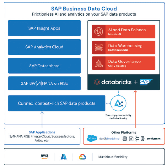 Una entrada reciente en el blog puede dar respuesta a la sorprendente reticencia de Databricks: en un gráfico (que se muestra a continuación), Databricks ilustra la profundización de la colaboración, según SAP. El gráfico muestra un principio de doble pila tal y como la comunidad SAP lo conoce de SAP NetWeaver con Abap y Java. Los servicios de datos de SAP se enumeran en azul y las soluciones de Databricks junto a ellos en rojo. Estas dos pilas están conectadas por el encabezado común «SAP Business Data Cloud» y en la parte inferior por una interfaz discreta llamada «Conectividad sin copias a través de Delta Sharing». SAP y Databricks tienen, por tanto, un punto de cristalización común y esperan profundizar en su asociación.