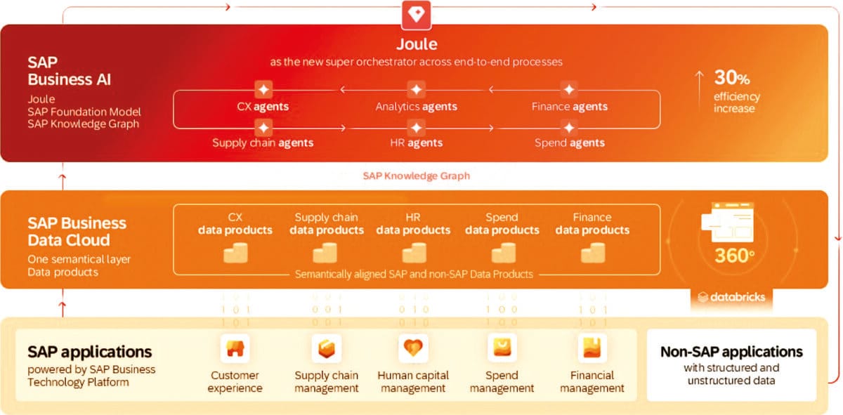 Avec la BTP, la base technique est créée pour développer des extensions en dehors de l'ERP principal tout en garantissant une intégration profonde. Grâce à des services centraux comme SAP Integration Suite, SAP Event Mesh ou SAP Extension Suite, les processus peuvent être orchestrés de manière transparente et les données peuvent être reliées sémantiquement. La base de données qui en résulte - appelée Business Data Fabric - n'est pas seulement cohérente, elle est également compatible avec l'IA. Cela signifie que les données ne sont pas seulement stockées, mais qu'elles peuvent être utilisées activement, par exemple pour la reconnaissance des formes, l'automatisation des processus ou l'aide à la décision.