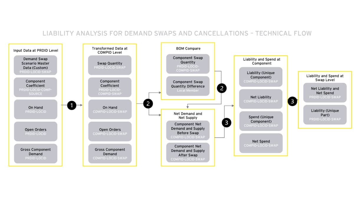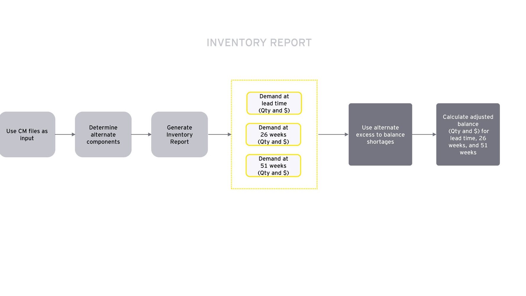 Le moteur initial de cette transformation au sein de l'entreprise mondiale de semi-conducteurs Fortune 50 était la nécessité de standardiser les processus à travers les divisions et d'identifier avec précision les dettes liées aux produits finis et aux composants lors d'événements tels que les échanges de demande et les annulations de produits. Par exemple, lorsqu'un échange de demande a lieu, la demande d'un produit est transférée vers un autre produit ou une autre ligne de produits ; les dettes se déplacent entre les fournisseurs et les sites de production, ce qui peut entraîner des risques financiers si elles ne sont pas suivies de près. En outre, la chaîne d'approvisionnement s'étend sur plusieurs sites mondiaux et des milliers d'UGS, ce qui complique encore la gestion de ces dettes au niveau mondial. Pour remédier à ce problème, le rapport d'inventaire statique reflétait la demande sur différents intervalles hebdomadaires afin d'assurer la transparence et le rapprochement à tous les horizons de planification.