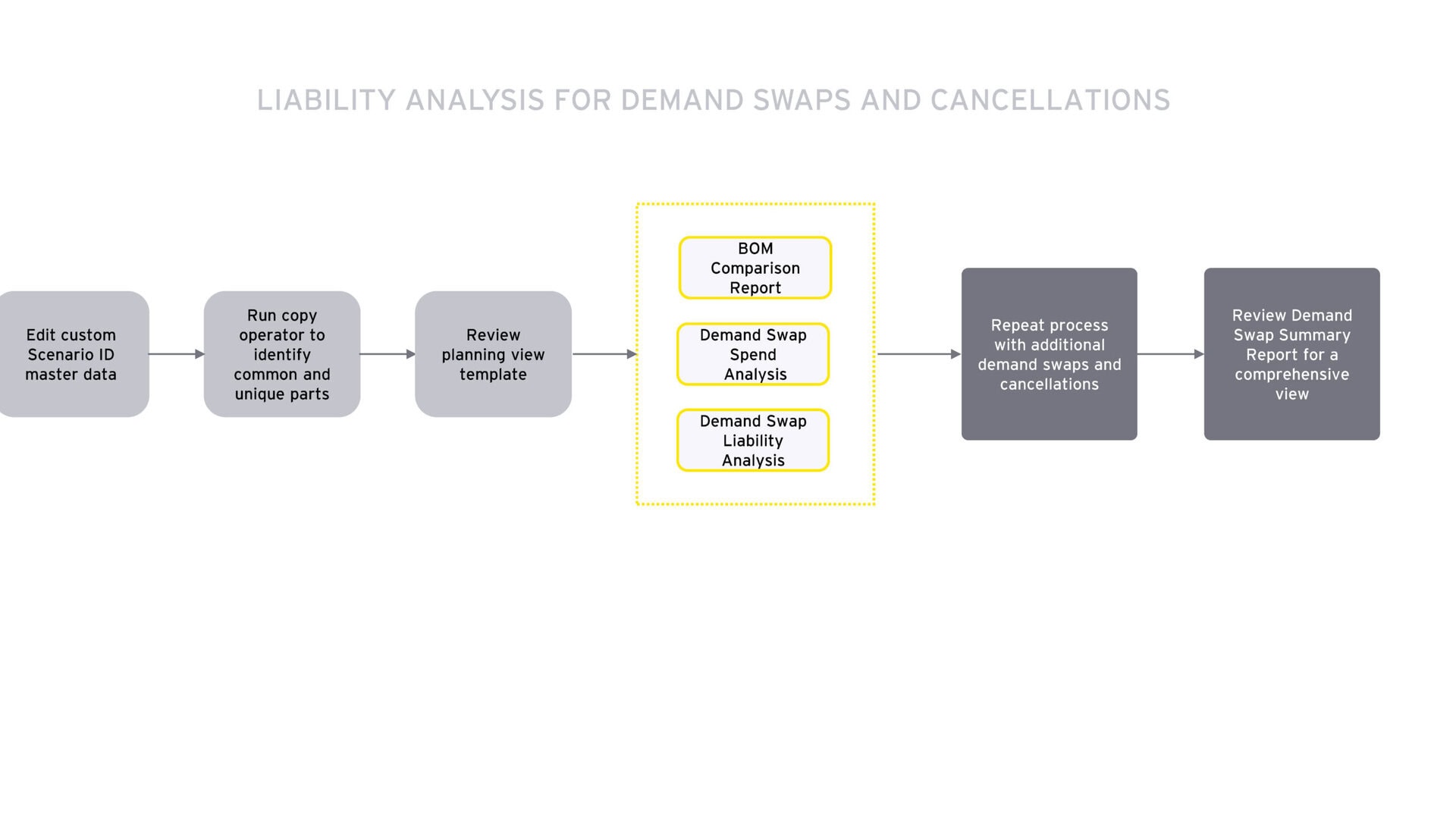 Les planificateurs initient des swaps de demande ou des annulations en utilisant des données de base définies par l'utilisateur, puis en exécutant un opérateur de copie pour générer les rapports d'engagement dans un modèle d'affichage de planification spécifique. Une analyse détaillée peut être effectuée au niveau de l'ID du scénario ou être résumée dans un modèle hebdomadaire qui consolide le total des engagements et des dépenses. Les avantages de l'introduction de ces rapports ont été considérables : les swaps et les annulations, qui prenaient des heures auparavant, ont pu être effectués en 10 minutes. Le concept d'ID de scénario prend également en charge plusieurs échanges de demande ou annulations en une seule transaction. Les planificateurs peuvent vérifier le récapitulatif des dépenses et des engagements totaux sur plusieurs transactions au niveau des composants de chaque nomenclature.